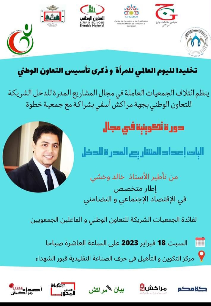 تخليدا لليوم العالمي للمرأة، و ذكرى تأسيس التعاون الوطني، ينظم إئتلاف الجمعيات العاملة في مجال المشاريع المدرة للدخل، الشريكة للتعاون الوطني بجهة مراكش اسفي، بشراكة مع جمعية خطوة، دورة تكوينية في مجال “أليات إعداد المشاريع المدرة للدخل” من تأطير الأستاذ خالد وحشي إطار متخصص في الإقتصاد الإجتماعي و التضامني لفائدة الجمعيات الشريكة للتعاون الوطني و الفاعلين الجمعويين وذلك يوم السبت 18 فبراير 2023 على الساعة العاشرة صباحا بمركز التكوين و التأهيل في حرف الصناعة التقليدية قبور الشهداء