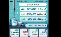وبلغ مجموع الحالات النشطة 655 حالات، فيما لم يتم تسجيل أي حالة خطيرة خلال الـ24 ساعة الأخيرة. وبلغ معدل ملء أسرة الإنعاش المخصصة لـ(كوفيد-19) 0,3 في المائة.