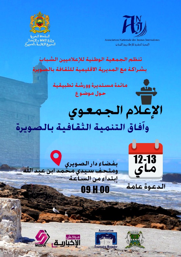 تنظم الجمعية الوطنية للإعلاميين الشباب بشراكة مع المديرية الاقليمية للثقافة والاتصال –قطاع الثقافة- بالصويرية وبدعم من المجلس الجماعي للصويرة وجمعية الصويرة موكادور مائدة مستديرة وورشة تطبيقية حول موضوع “الإعلام الجمعوي وآفاق التنمية الثقافية بالصويرة” وذلك يومي 12 و13 ماي 2018 بفضاء دار الصويري ومتحف سيدي محمد ابن عبد الله، فبعد نجاح الدورات السابقة التي تم تنظيمها بمدينة مراكش، تحناوت، بنجرير وأسفي، تقارب الجمعية الوطنية للإعلاميين الشباب وضعية المجتمع المدني بالصويرة لتشخيص واقعه الحالي وتحديد نقط ضعفه وقوته واستثمارها في التخطيط لاستشراف المستقبل ببرنامج عمل محكم يروم تثمين المشهد الثقافي وإرساء نواة الاقتصاد الثقافي.