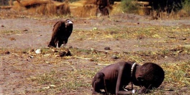 وللإحتفال بهذا اليوم، نتقاسم الصورة معكم أدناه، لطفل يُحتضر، وعيّنا عُقاب جائع تنتظره أن يُسلم الروح للسماء ليقتات على جسده الهزيل، الضعيف.. والواهن…