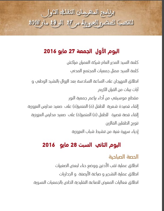 برنامج المهرجان الثقافي الأول للقطب الحظري العزوزية من 27 الى 29 ماي 2016