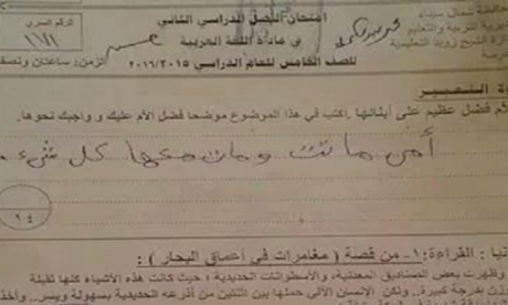تناقل مستخدمو موقع التواصل الاجتماعي “تويتر” صورة لسؤال ورد في امتحان اللغة العربية للمرحلة الابتدائية في مصر حول “فضل الأم العظيم على أبنائها” وإجابة أحد الطلاب عليه.