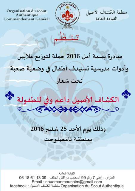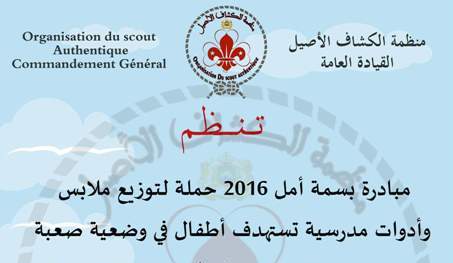 تعلن القيادة العامة لمنظمة الكشاف الأصيل عن انطلاق مبادرة بسمة أمل 2016 في مرحلتها الثالثة تحت شعار << الكشاف الأصيل داعم وفي للطفولة >> التى ترمي إلى القيام بحملة لتوزيع ملابس وأدوات مدرسية لفائدة 150 طفل وطفلة في وضعية صعبة بمنطقة تمصلوحت مراكش وذلك يومه الأحد 25 شتنبر 2016 .