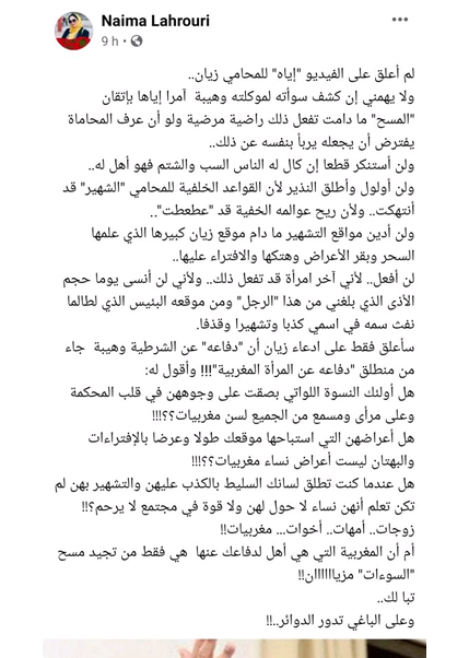 نشرت الشاعرة والإعلامية المغربية نعيمة الحروري تدوينة جديدة على صفحتها بموقع التواصل الإجتماعي ترد من خلالها على التصريحات البئيسة والرخيصة التي خرج بها المحامي محمد زيان ضد ضحايا توفيق بوعشرين