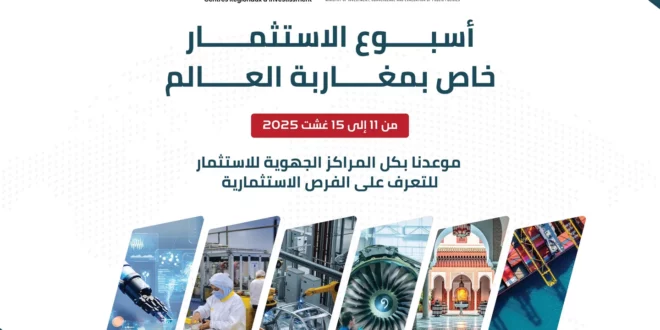 تنظم وزارة الاستثمار والتقائية وتقييم السياسات العمومية، من 11 إلى 15 غشت 2025، أسبوع الاستثمار خاص بمغاربة العالم، وذلك على مستوى المراكز الجهوية للاستثمار في الجهات الاثنتي عشرة للمملكة.