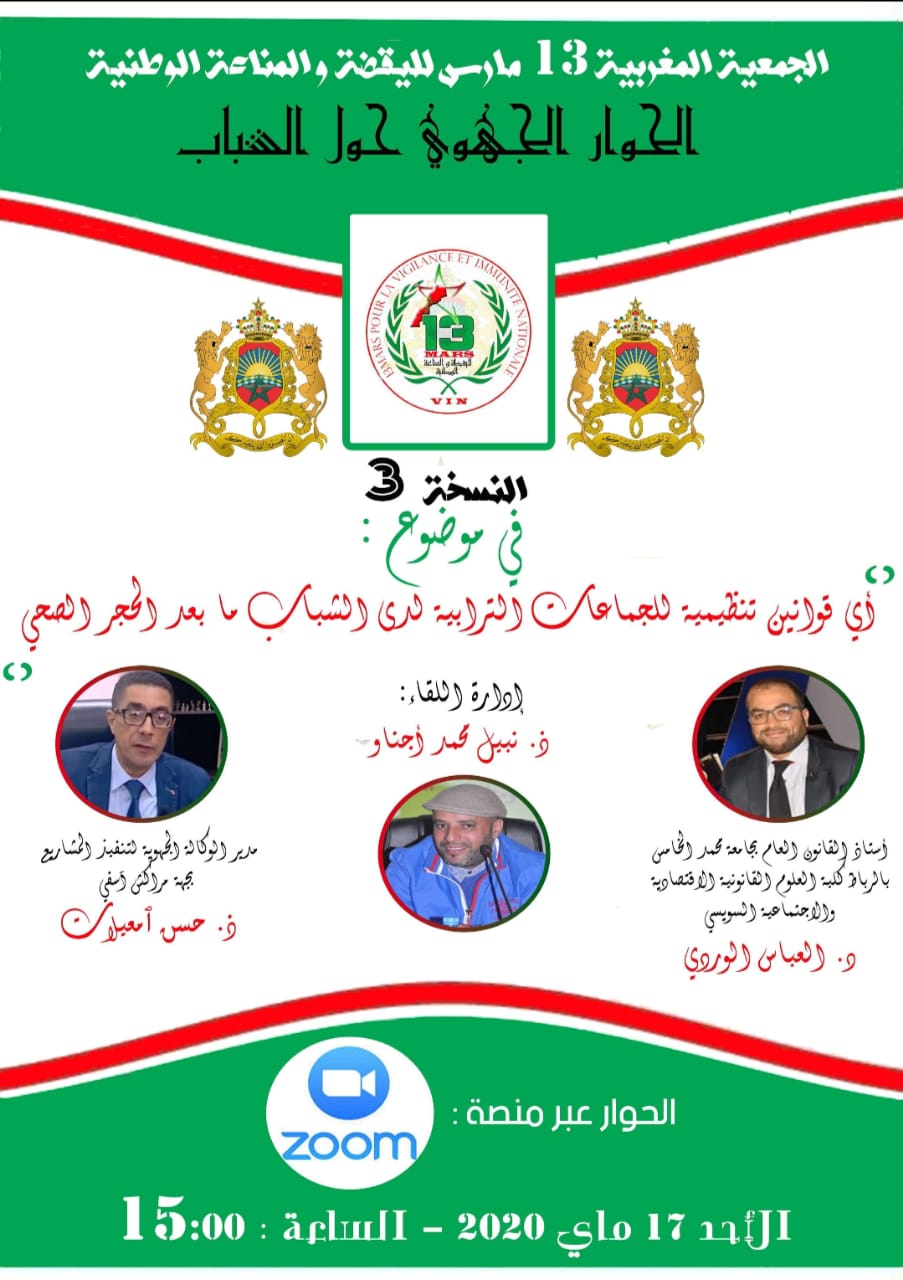 إجتمع ثلة من الإخصائيين الميدانيين والأكاديميين على مائدة عن بعد قام بتنشيطها ذ: نبيل محمد أجناو رئيس الجمعية المغربية 13 مارس لليقظة والمناعة القطب المشرف على تنظيم مسلسل الحوار الجهوي حول الشباب في نسخته الثالثة تحت موضوع”أي قوانين تنظيمية للجماعات الترابية لدى الشباب مابعد الحجر الصحي”