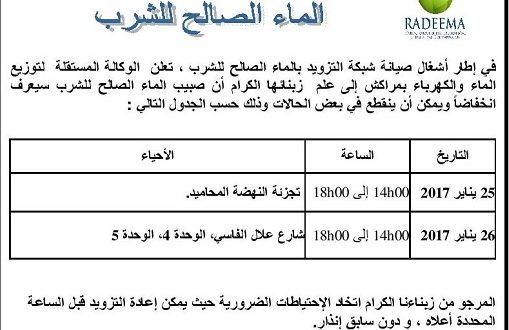 إعلان عن إنقطاع الماء الصالح للشرب بالمحاميد وشارع علال الفاسي هيئة التحرير 25 يناير، 2017 اضف تعليق راديما 2017-01-25 هيئة التحرير شاركها فسبوك تويتر قوقل بلوس LinkedIn