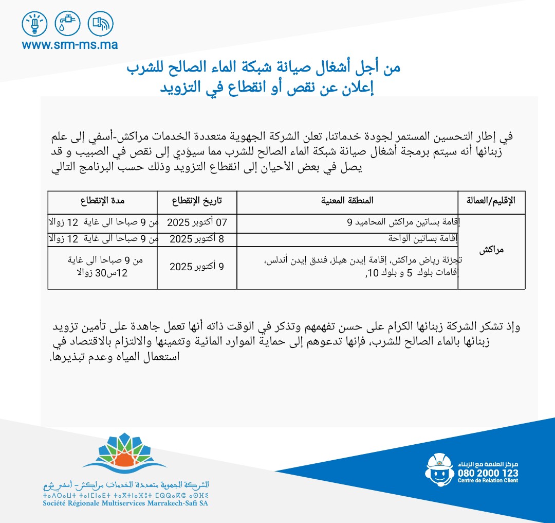 إعلان عن إنقطاع مرتقب في التزويد بالماء الصالح للشرب عن بعض الأحياء
