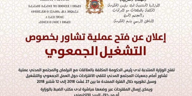 وبغية إعداد مقترحات تخص دور القطاع الجمعوي في التشغيل وتعزيزه والرفع من قابليته، وفي إطار إشراك الجمعيات في مسلسل إعداد هذه المقترحات، تفتح الوزارة المنتدبة لدى رئيس الحكومة المكلفة بالعلاقات مع البرلمان والمجتمع المدني عملية تشاور أمام جمعيات المجتمع المدني لتلقي الاقتراحات حول العمل الجمعوي والتشغيل وسبل تطويره خلال الفترة الممتدة ما بين 27 غشت 2018 إلى 12 شتنبر 2018.
