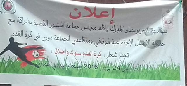 بمناسبة شهر رمضان الكريم،وفي إطار التنشيط الثقافي والرياضي،وبناءا على البرنامج الذي سطرته لجنة المرافق العمومية والخدمات ،يعتزم مجلس جماعة المشور القصبة بشراكة مع جمعية الأعمال الاجتماعية لموظفي ومتقاعدي الجماعة تنظيم أيام ثقافية و رياضية ابتداءا من 24 يونيو 2016،وسطر البرنامج كالتالي: 1- دوري في كرة القدم بين فرق الأحياء المكونة لجماعة المشور القصبة. 2- مسابقة في تجويد القرآن الكريم لفائدة أطفال الجماع