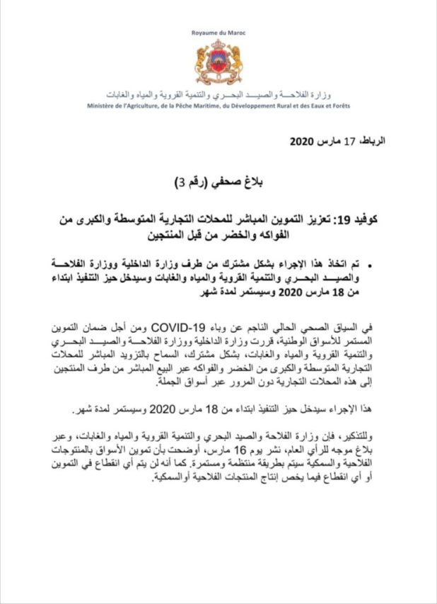 في السياق الصحي الحالي الناجم عن وباء COVID-19 ومن أجل ضمان التموين المستمر للأسواق الوطنية، قررت وزارة الداخلية ووزارة الفلاحـــة والصيــــد البحـــري والتنمية القروية والمياه والغابات، بشكل مشترك، السماح بالتزويد المباشر للمحلات التجارية المتوسطة والكبرى من الخضر والفواكه عبر البيع المباشر من طرف المنتجين إلى هذه المحلات التجارية دون المرور عبر أسواق الجملة.