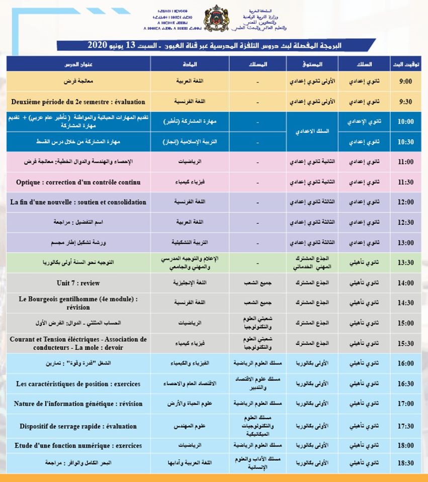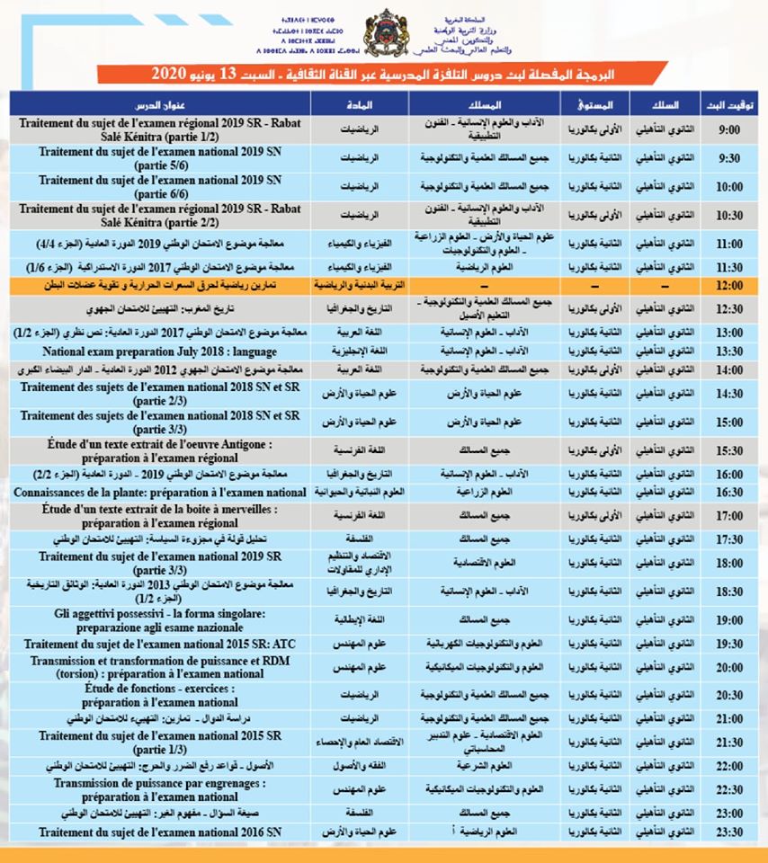 البرمجة المفصلة لبث الدروس المدرسية السبت 13 يونيو