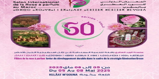 تنظم الدورة الـ 60 للمعرض الدولي للورد العطري بالمغرب خلال الفترة من 05 إلى 08 ماي المقبل بمدينة قلعة مكونة، وهو موعد سنوي ينظم تحت الرعاية السامية لصاحب الجلالة الملك محمد السادس.