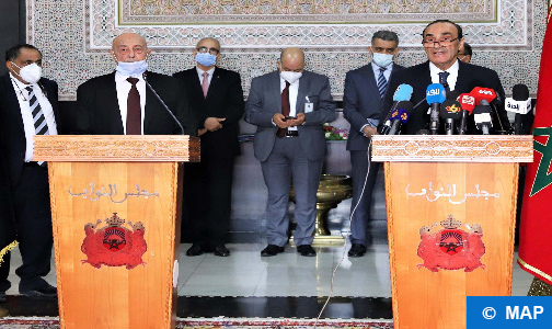 وأعرب السيد عقيلة، في لقاء صحافي مشترك مع رئيس مجلس النواب السيد الحبيب المالكي عقب مباحثاتهما اليوم الجمعة بالرباط، عن امتنانه وتقديره لجلالة الملك ومجلس النواب والحكومة وللشعب المغربي على الدعم المستمر والخالص للشعب الليبي في محنته التي مر بها في الفترة الماضية والتي تشرف على الانتهاء، مبرزا أنه “بفضل جهود المغرب، وتحت إشراف ورعاية جلالة الملك، توصلنا في النهاية إلى تكوين سلطة تنفيذية من مجلس رئاسي ورئيس ونائبين وحكومة وحدة وطنية نالت ثقة مجلس النواب وأدت اليمين الدستورية وباشرت في أعمالها الآن “.