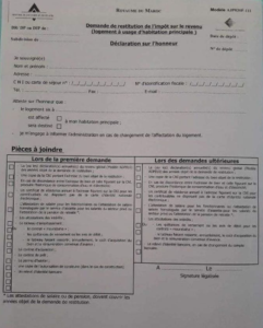 الجهوية او الاقليمية للضرائب حيث يدفع الملف الإقرارات السنوية لمجموع الدخل (نموذج ADP010A (للسنوات موضوع طلب الاسترداد ؛ تسحب من المديرية طلبا يتضمن تحديد الفترة الزمنية موضوع طلب الاسترداد ؛ -نسخة من البطاقة الوطنية للتعريف؛ تحتوي على عنوان العقار موضوع الاسترداد ( في حال عدم مطابقة عنوان بطاقة التعريف الوطنية لعنوان العقار يجب الادلاء بجرد كامل لاستهلاك الماء اأو الكهرباء) المديرية الاقليمية او الجهوية للضرائب ثم يعبأ ويصادق عليه ثم تحتفط بنسخة منه تأخذها معك عند الدفعتصريح بالشرف مختوم ومصادق عليه يصرح فيه المعني بالأمر بتخصيص العقار لسكناه الرئيسية؛ (يسحب منشهادة السكنى بالعنوان المتواجد في البطاقة الوطنية للتعريف؛ سيطالبونك بها) للموظفين او شهادة الأجرة تتضمن خطاب مصلحة الوعاء الضريبي بالنسبة للعاملين بالقطاع الخاص او شهادةشهادة الأجرة مفصلة من 01/01 إلى 12/31 للسنة أو السنوات موضوع طلب الاسترداد؛ شهادة الأجرة بالنسبة المعاش للمتقاعدين (مع ضرورة ان تكون شهادة الأجرة هذه تخص كل السنة او السنوات المراد استرجاعها…