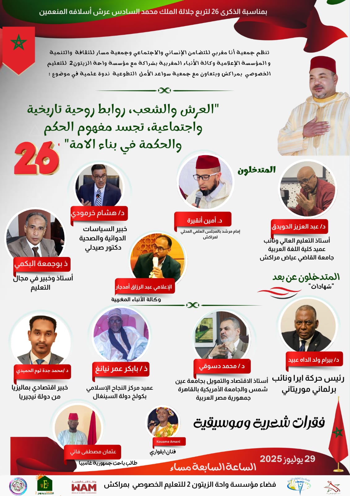 بمناسبة الذكرى السادسة والعشرين لتربع صاحب الجلالة الملك محمد السادس نصره الله وأيده على عرش أسلافه المنعمين تنظم جمعيات “أنا مغربي للتضامن الإنساني والاجتماعي”، و”جمعية مسار للثقافة والتنمية” و “المؤسسة الإعلامية وكالة الأنباء المغربية” بشراكة مع مؤسسة “واحة الزيتون 2 للتعليم الخصوصي” بتعاون مع “جمعية سواعد الأمل التطوعية” ندوة علمية تحت عنوان: