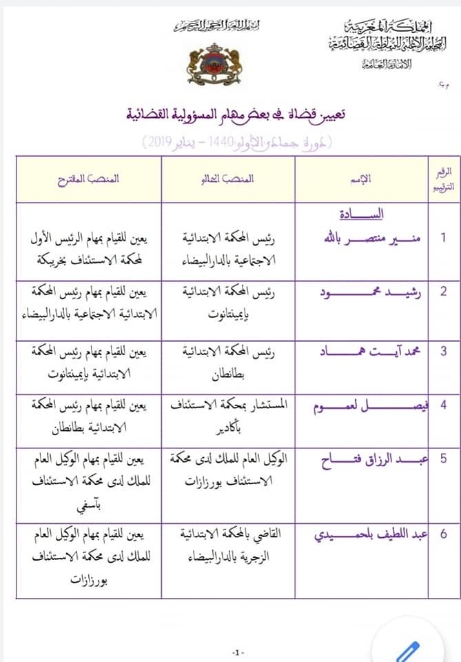 اللائحة الكاملة لتعيين قضاة في بعض مهام المسؤولية القضائية هيئة التحرير 13 نوفمبر، 2019 اضف تعليق ; القضاة الجدد 2019-11-13 هيئة التحرير شاركها فسبوك تويتر قوقل بلوس LinkedIn