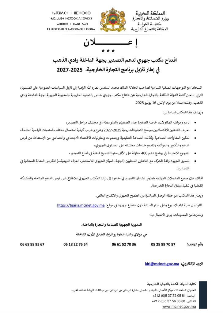 المديرية الجهوية للتجارة والصناعة بالداخلة تفتتح مكتبا جهويا جديد لدعم التصدير
