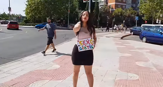 وظهرت الاخيرة في فيديو نشرته على قناتها ، وهي تتجول بشوارع العاصمة الإسبانية مدريد، وعلى صدرها لوحة مكتوب عليها “الجنس بالمجان”