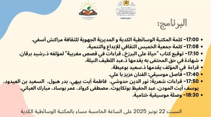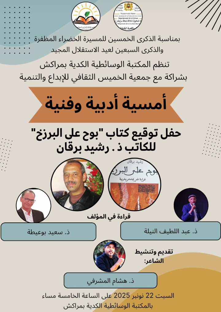 تخليداً للذكرى الخمسين للمسيرة الخضراء المظفرة، والذكرى السبعين لعيد الاستقلال المجيد، تنظم المكتبة الوسائطية الكدية بمراكش، تحت إشراف المديرية الجهوية للثقافة مراكش–آسفي، وبشراكة مع جمعية الخميس الثقافي للإبداع والتنمية، أمسية أدبية وفنية يوم السبت 22 نونبر 2025، ابتداءً من الساعة الخامسة مساءً بقاعة الندوات للمكتبة.