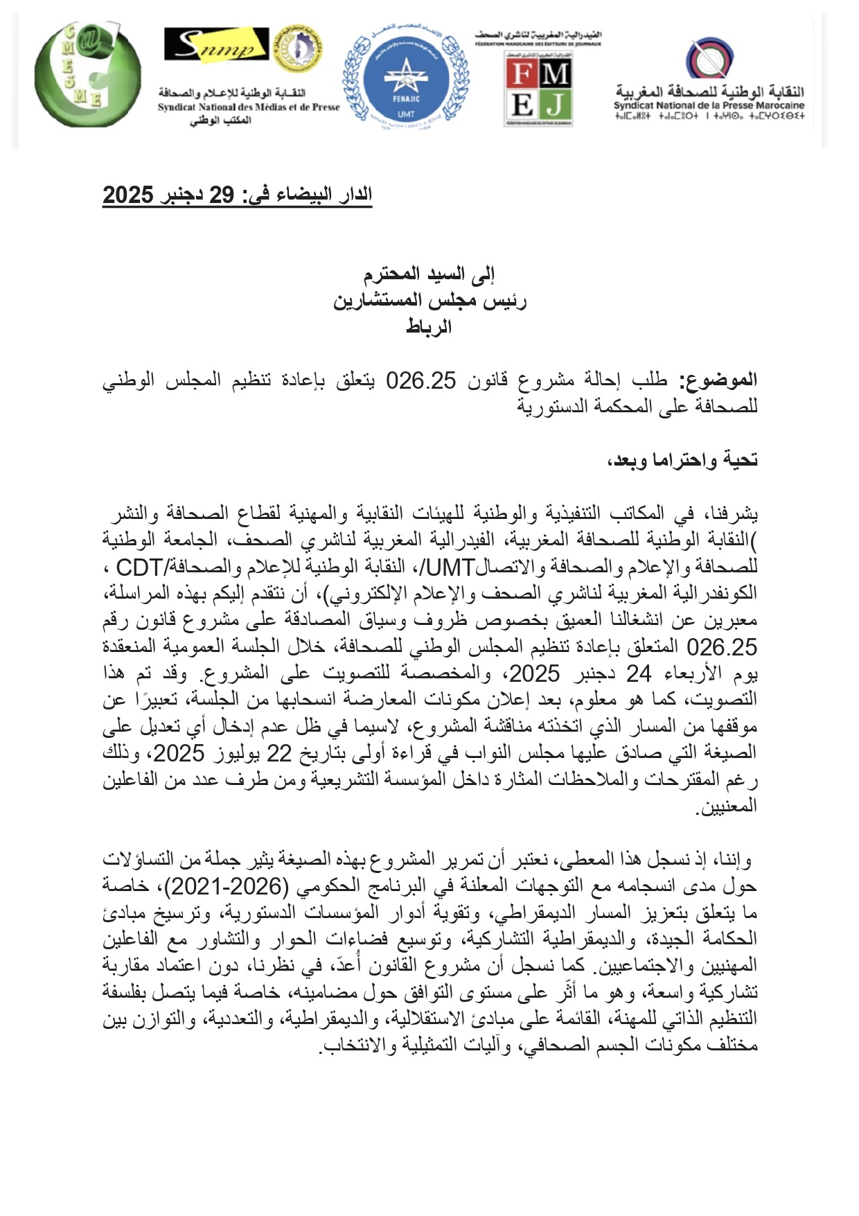 الرئيسية » 24 ساعة » الهيئات المهنية والنقابية للصحافة تطالب بإحالة مشروع ” قانون 026.25″ على المحكمة الدستورية