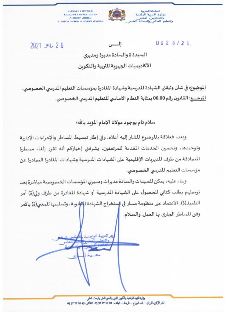 قررت وزارة التربية الوطنية إلغاء مسطرة المصادقة من طرف المديريات الإقليمية على الشهادات المدرسية وشهادات المغادرة الصادرة من مؤسسات التعليم الخصوصي.