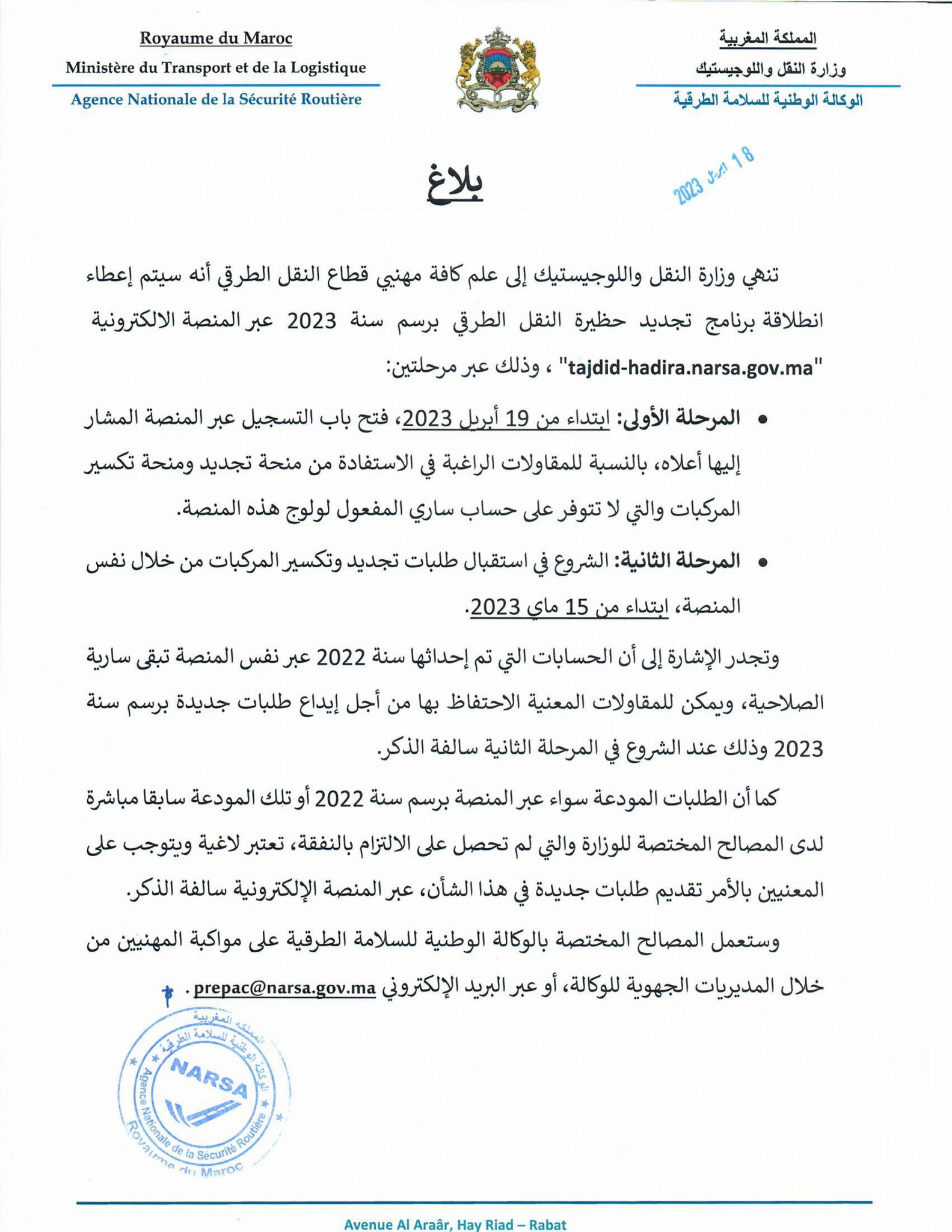 أعلنت وزارة النقل واللوجيستيك أنه سيتم إعطاء انطلاقة برنامج تجديد حظيرة النقل الطرقي برسم سنة 2023 عبر المنصة الالكترونية “tajdid-hadira.narsa.gov.ma”