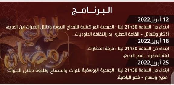 انسجاما مع الأجواء الروحانية لشهر رمضان المبارك، تنظم المديرية الجهوية للثقافة مراكش أسفي فعاليات ” روحانيات ليالي رمضان” من خلال مجموعة من الحفلات الفنية ذات طابع روحاني في الفترة الممتدة ما بين 12 و25 أبريل 2022 م الموافق من 10 و23 رمضان 1443ه ، وفي هذا الإطار ستُحيي الجمعية المراكشية للأمداح النبوية ودلائل الخيرات ابن العريف حفلا فنيا بالقاعة الصغرى بالمركز الثقافي الداوديات يوم الثلاثاء 12 أبريل 2022 ابتداء من التاسعة والنصف ليلا، كما سيتم برمجة حفل فني ثاني تُحييه فرقة الحضًارات ومجموعة نور الهدى للإنشاد والسماع بالمعلمة التاريخية قصر البديع يوم الإثنين 18 أبريل 2022 ابتداء من الساعة التاسعة والنصف، وسيسدل الستار عن فعاليات “روحانيات ليالي رمضان” بحفل فني لفرقة الجمعية اليوسفية للتراث والسماع وتلاوة دلائل الخيرات بالفضاء التاريخي لقصر الباهية يوم الإثنين 25 أبريل 2022.