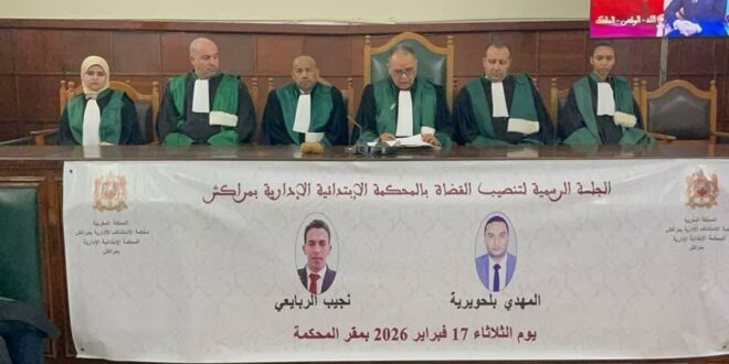 إحتضنت المحكمة الابتدائية الإدارية بمراكش، يوم الثلاثاء 17 فبراير 2026، جلسة رسمية خُصصت لتنصيب قاضيين جديدين، وذلك في إطار تعزيز الموارد البشرية بالجهاز القضائي والرفع من نجاعة الأداء داخل المحاكم الإدارية.