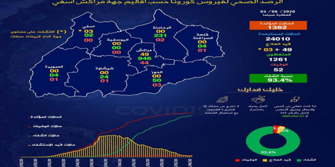 وأصبحت أقاليم قلعة السراغنة والرحامنة والصويرة وشيشاوة والحوز خالية من الوباء بعد تماثل حالات الإصابة للشفاء، فيما ظل إقليم اليوسفية خاليا من أية إصابة منذ ظهور الوباء بالجهة.