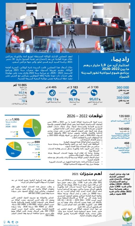راديما، استثمار أزيد من 1,9 مليار درهم ما بين 2022-2026 برنامج طموح لمواكبة تطور المدينة الحمراء سليمة مراكش 24 19 مارس، 2022 اضف تعليق 2022-03-19 سليمة مراكش 24 شاركها فسبوك تويتر قوقل بلوس LinkedIn