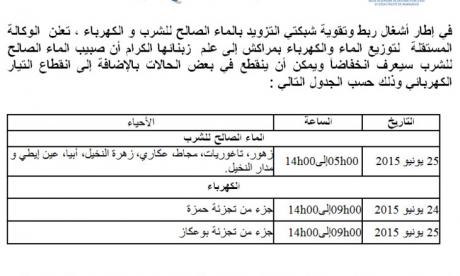 أحياء زهور، تاغوريات، مجاط، عكاري، زهرة النخيل، أبيا، عين إيطي و مدار النخيل، انقطاعا في الماء الصالح للشرب يوم 25 يونيو 2015 ابتداء من الساعة 05h00 إلى 14h00.