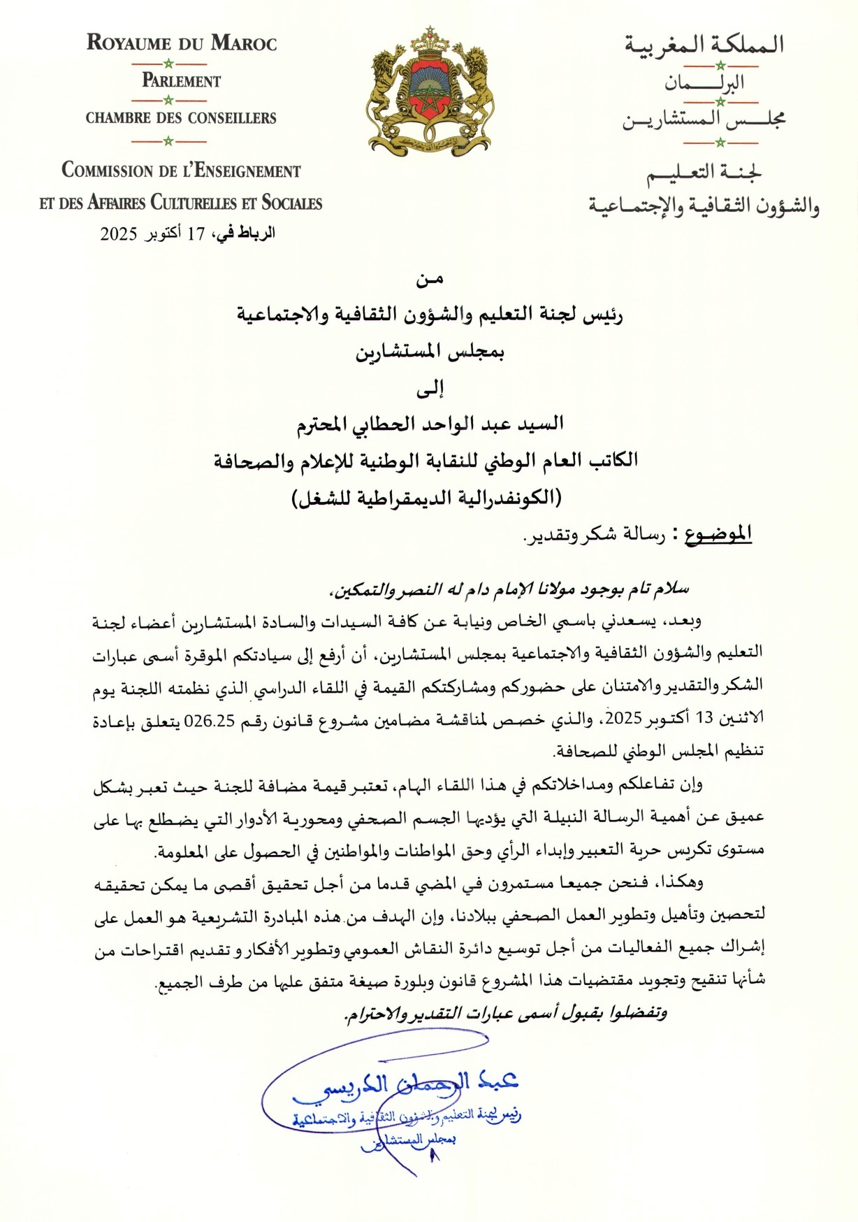 رسالة شكر موجهة للسيد عبد الواحد الحطابي الكاتب العام للنقابة الوطنية للصحافة والإعلام