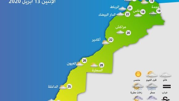 تتوقع مديرية الأرصاد الجوية الوطنية بالنسبة ليوم الاثنين أن تظل الأجواء غائمة في أغلب الأوقات، مع نزول زخات مطرية فوق منطقة طنجة ،وكذا السواحل والسهول الممتدة شمال الجديدة وذلك خلال الصباح.