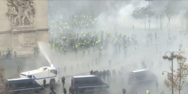 وأضرم محتجون النار في عدد من السيارات في طريق الشانزليزيه والمناطق المحيطة بها وسط العاصمة باريس، وحشدت الشرطة آلافا من عناصرها في باريس، لكنها لم تتمكن من إخماد الاحتجاجات، وقالت إنها أوقفت نحو ثلاثمئة شخص.