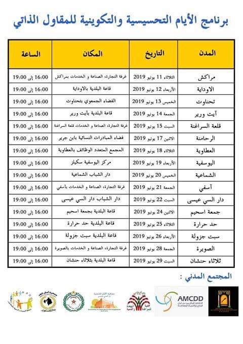 تنظم مؤسسة مبادرة للشباب و المقاولة بشراكة مع مغرب مقاولات، ولاية جهة مراكش آسفي، غرفة التجارة والصناعة و الخدمات لجهة مراكش آسفي، غرفة الصناعة التقليدية لجهة مراكش آسفي و المركز الجهوي للإستثمار و بتعاون مع الوكالة الوطنية لإنعاش التشغيل والكفاءات (أنابيك)، التجاري وفا بنك، مؤسسة التوفيق للتمويل الأصغر، المكتب الشريف للفوسفاط، التعاون الوطني، مكتب التنمية والتعاون و المديرية العامة للضرائب وكذلك العديد من مؤسسات المجتمع المدني المحلي و الجهوي، تنظم قافلة تحسيسية تحت شعار :
