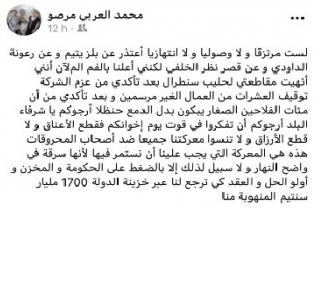 كشف محمد العربي مرصو، نائب رئيس مقاطعة بني مكادة بطنجة، الموالي لحزب العدالة والتنمية، عن توقفه عن مقاطعة حليب “سنطرال دانون” ، بعد تأكده من عزم الشركة توقيف العشرات من عمالها غير الموسميين ، مضيفا بالقول “معركتنا جميعا ضد أصحاب المحروقات هذه هي المعركة التي يجب علينا أن نستمر فيها لأنها سرقة في واضح النهار”. و قال مرصو في تدوينة على الفايسبوك ” لست مرتزقا ولا وصوليا ولا انتهازيا أعتذر عن بلز يتيم وعن رعونة الداودي وعن قصر نظر الخلفي لكنني أعلن بالفم الملأن أنني أنهيت مقاطعتي لحليب سنطرال بعد تأكدي من عزم الشركة توقيف العشرات من العمال الغير مرسمين وبعد تأكدي من أن مئات الفلاحين الصغار يبكون بدل الدمع حنظلا”. وأضاف المسؤول “أرجوكم ياشرفاء البلد أرجوكم أن تفكروا في قوت إخوانكم فقطع الأعناق ولا قطع الأرزاق ولاتنسوا معركتنا جميعا ضد أصحاب المحروقات هذه هي المعركة التي يجب علينا أن نستمر فيها لأنها سرقة في واضح النهار ولا سبيل لذلك إلا بالضغط على الحكومة والمخزن وأولو الحل والعقد كي ترجع لنا عبر خزينة الدولة 1700 مليار سنتيم المنهوبة منا”.