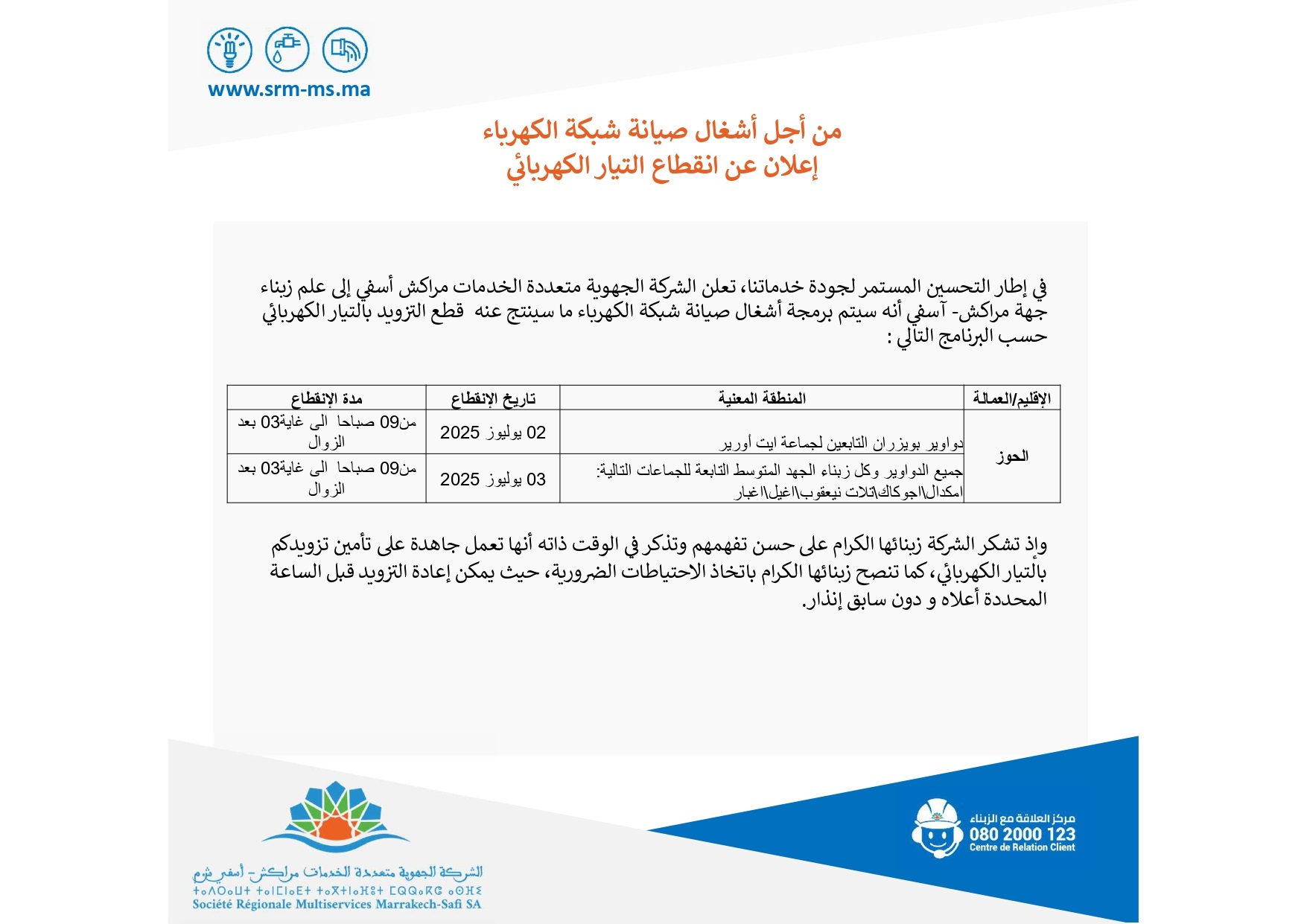 من أجل أشغال الصيانة .إعلان عن إنقطاع مرتقب للتيار الكهربائي بأيت أورير