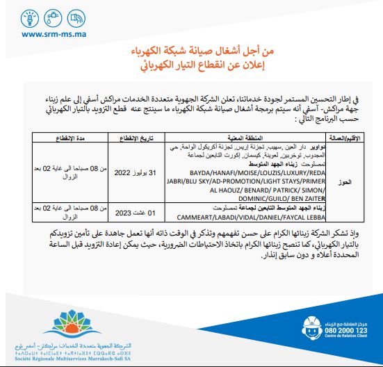 من أجل أشغال صيانة شبكة الكهرباء .. إعلان عن إنقطاع مرتقب للتيار الكهربائي في أجزاء من جماعة تمصلوحت