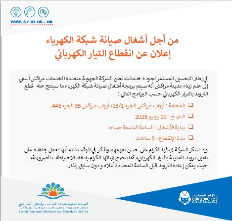 من أجل أشغال صيانة شبكة الكهرباء ..إعلان عن إنقطاع مرتقب في التيار الكهربائي هيئة التحرير 18 يونيو، 2025 اضف تعليق 2025-06-18 هيئة التحرير شاركها فسبوك تويتر قوقل بلوس LinkedIn
