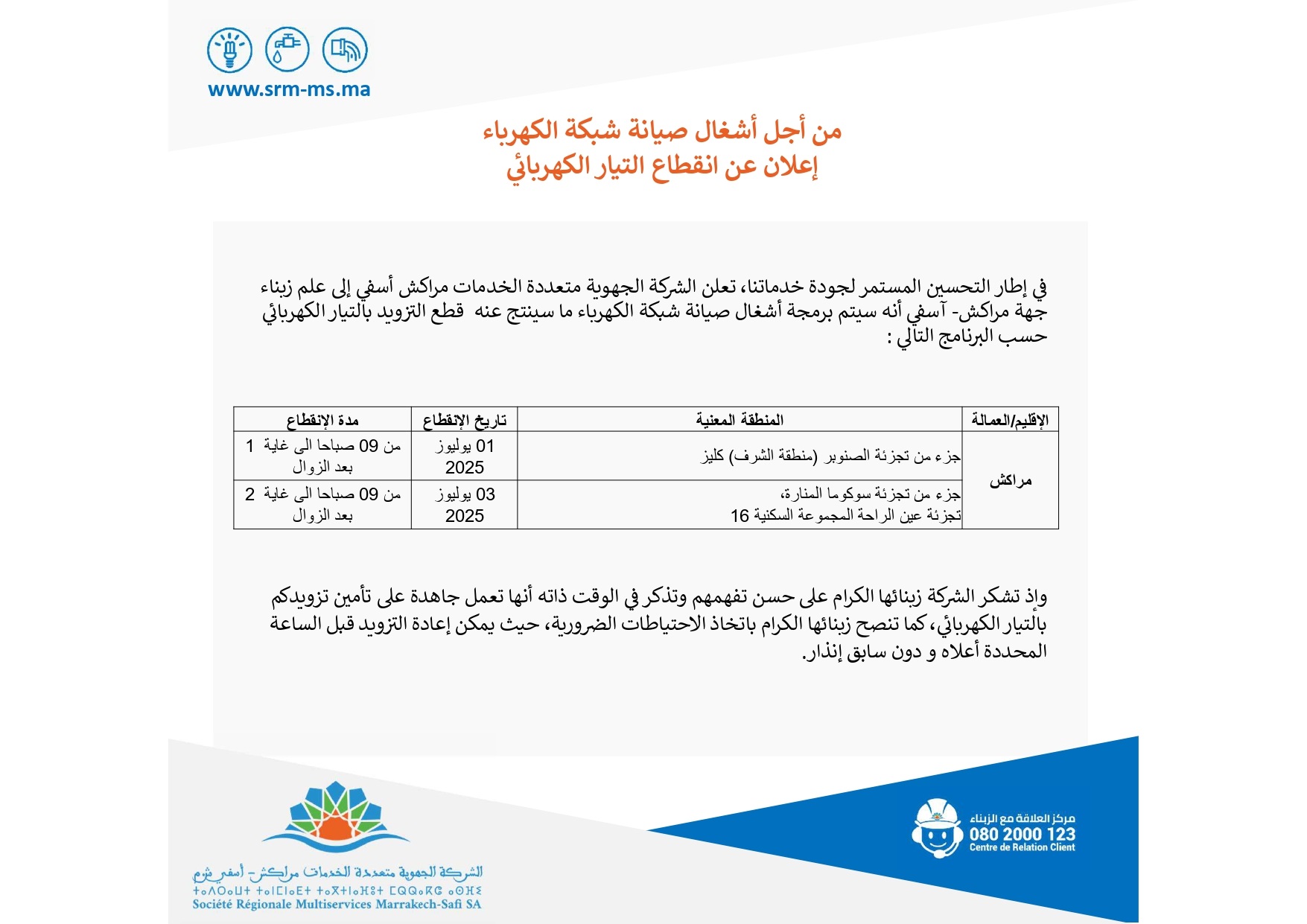 من أجل أشغال صيانة شبكة الكهرباء إعلان عن إنقطاع مرتقب للتيار الكهربائي هيئة التحرير 26 يونيو، 2025 اضف تعليق 2025-06-26 هيئة التحرير شاركها فسبوك تويتر قوقل بلوس LinkedIn