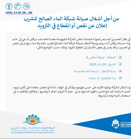 من أجل أشغال صيانة شبكة الماء الصالح للشرب إعلان عن إنقطاع مرتقب في التزويد هيئة التحرير 28 مايو، 2025 اضف تعليق 2025-05-28 هيئة التحرير شاركها فسبوك تويتر قوقل بلوس LinkedIn