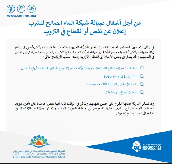 من أجل صيانة الشبكة ..إعلان غن إنقطاع أو نقص مرتقب في التزويد بالماء الصالح للشرب بمنطقة أبراج الفضل