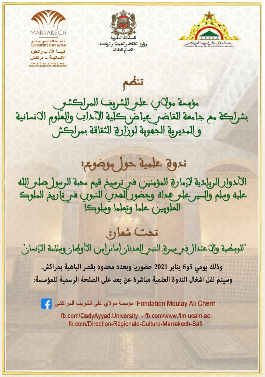 نظم مؤسسة مولاي علي الشريف ندوة علمية حول موضوع “الأدوار الريادية لإمارة المؤمنين في ترسيخ قيم محبة الرسول صلى الله عليه وسبل والسير على هداه وحضور الهدي النبوي في تاريخ الملوك العلويين علما وتعليما وسلوكا” وذلك يومي 5و6 يناير 2021 بشراكة مع المديرية الجهوية لوزارة الثقافة بمراكش و كلية الآداب والعلوم الإنسانية بمراكش