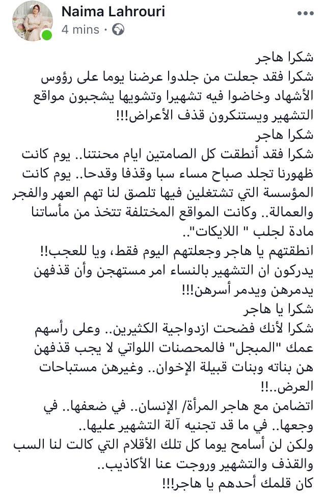 نعيمة لحروري ..تقصف هاجر الريسوني بتدوينة فايسبوكية هيئة التحرير 5 سبتمبر، 2019 اضف تعليق خرجت نعيمة لحروري إحدى ضحايا توفيق بوعشرين بتدوينة فايسبوكية مثيرة على خلفية إعتقال هاجر الريسوني الصحفية العاملة بجريدة أخبار اليوم بوعشرين نعيمة هاجر الريسوني 2019-09-05 هيئة التحرير شاركها فسبوك تويتر قوقل بلوس LinkedIn