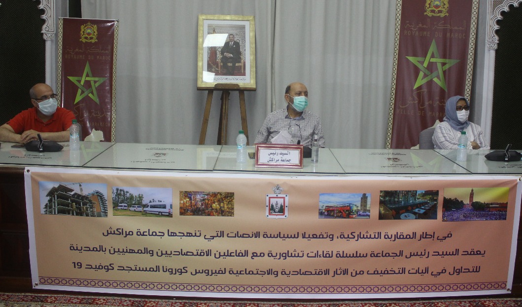 في إطار اللقاءات التواصلية التي تعقدها جماعة مراكش مع الفاعلين الاقتصاديين والمهنيين بالمدينة، لمناقشة الإجراءات والتدابير الممكنة لمعالجة تداعيات جائحة كورونا كوفيد 19 على القطاع السياحي والمهني، انعقد يوم الخميس 04 يونيو 2020 بقاعة الاجتماعات الكبرى بالقصر البلدي، اللقاء الرابع، ضمن السلسلة الثانية من هذه اللقاءات، مع الجمعية الوطنية لأرباب المقاهي والمطاعم بالمغرب، الفرع الاقليمي لمراكش.