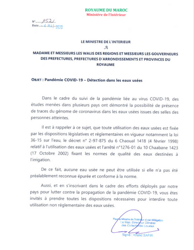 و إستحضرت الرسالة إشارة للقوانين والنصوص التشريعية التي تنظم إستعمال وإعادة إستعمال المياه العادمة في السقي مشيرة إلى أن المياه العادمة يجب أن تخضع للتصفية والمعالجة التي تضمن مطابقتها للمعايير المعمول بها في المغرب قبل إعادة إستعمالها في السقي