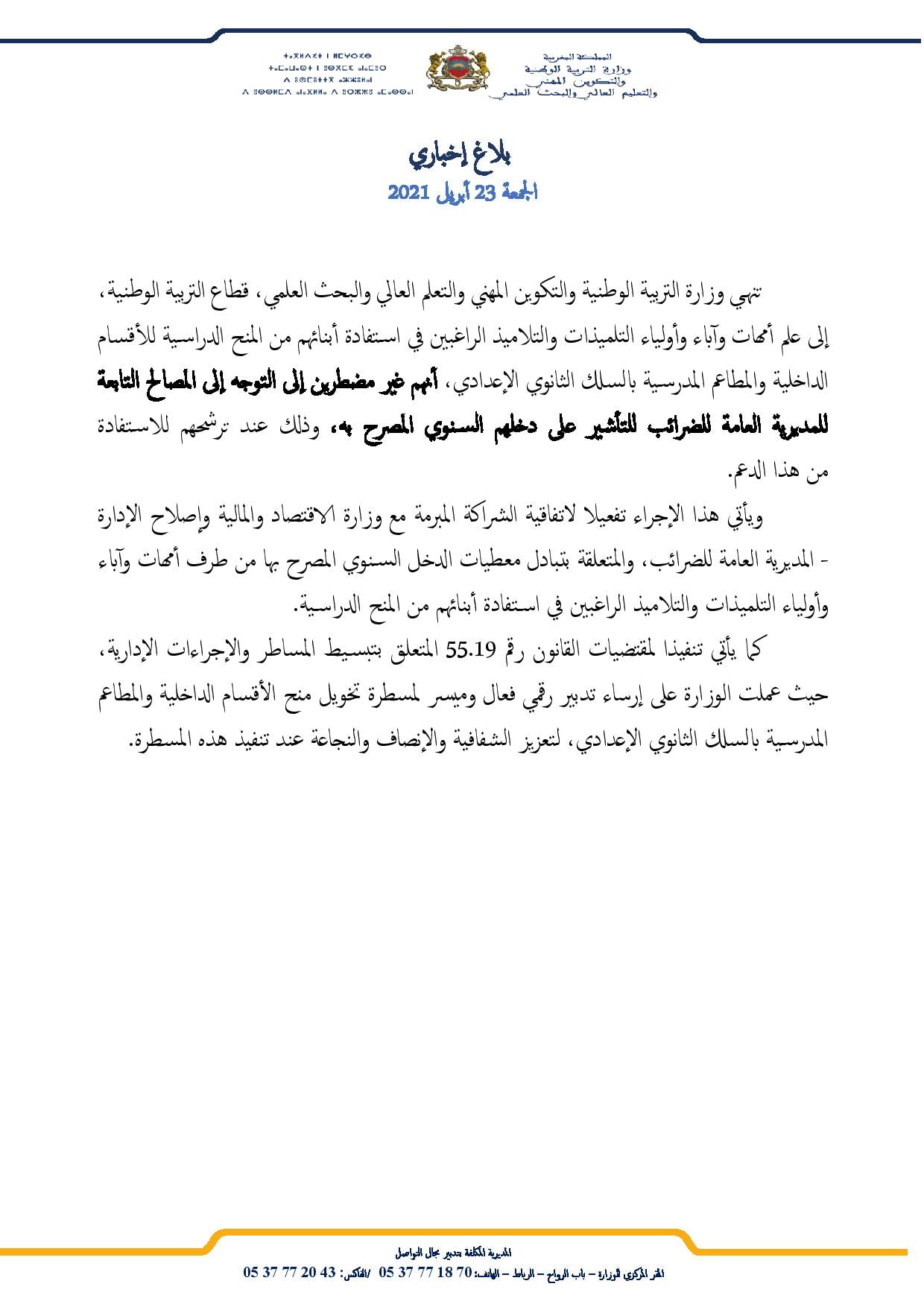 تنهي وزارة التربية الوطنية والتكوين المهني والتعلم العالي والبحث العلمي، قطاع التربية الوطنية، إلى علم أمهات وآباء وأولياء التلميذات والتلاميذ الراغبين في استفادة أبنائهم من المنح الدراسية للأقسام الداخلية والمطاعم المدرسية بالسلك الثانوي الإعدادي، أنهم غير مضطرين إلى التوجه إلى المصالح التابعة للمديرية العامة للضرائب للتأشير على دخلهم السنوي المصرح به، وذلك عند ترشحهم للاستفادة من هذا الدعم.