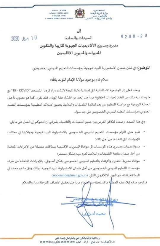 قرار وزاري جديد يهم مدارس التعليم الخصوصي بمراكش .. هيئة التحرير 10 أبريل، 2020 اضف تعليق التعليم الخصوصي مراكش 2020-04-10 هيئة التحرير شاركها فسبوك تويتر قوقل بلوس LinkedIn