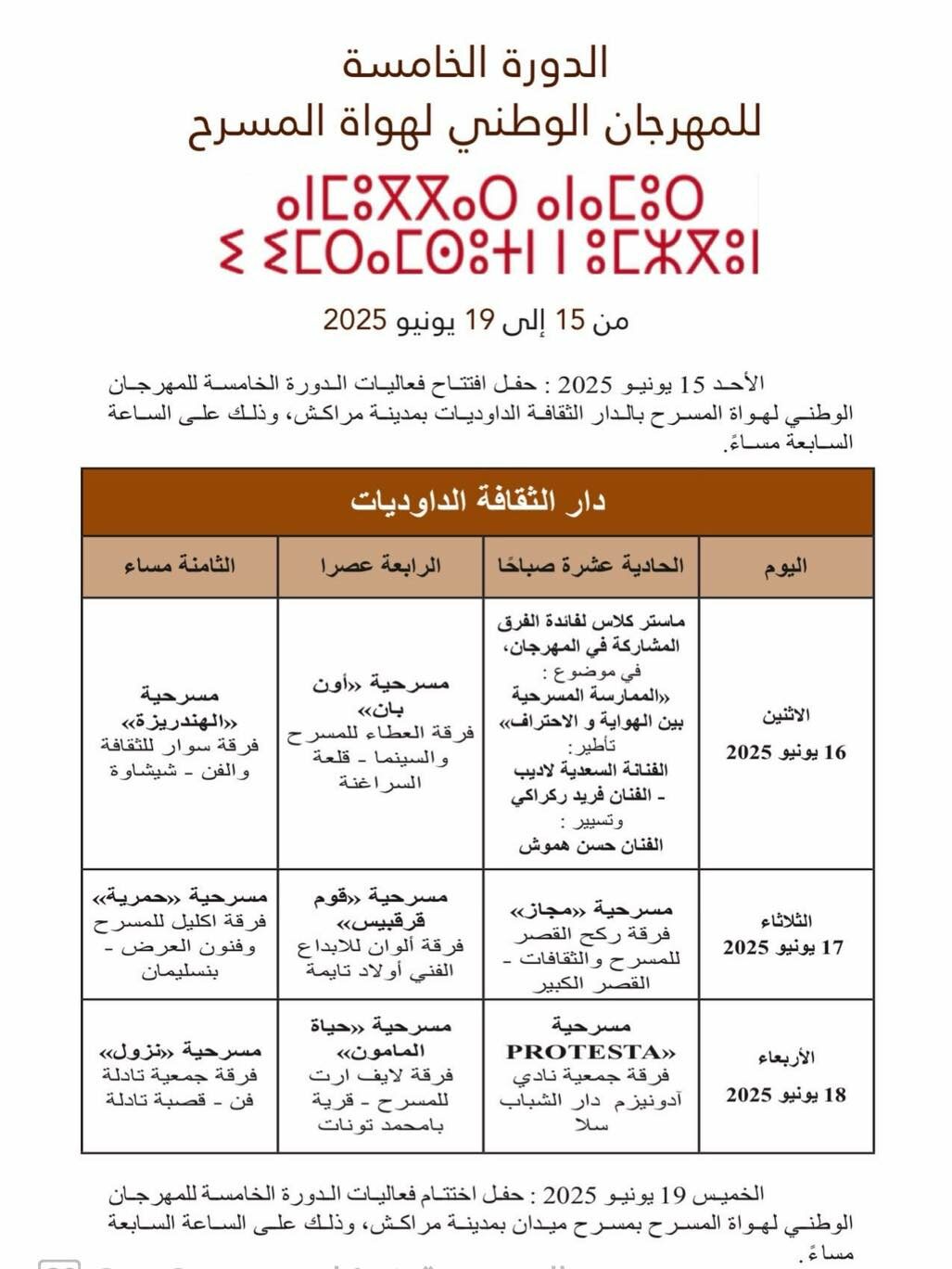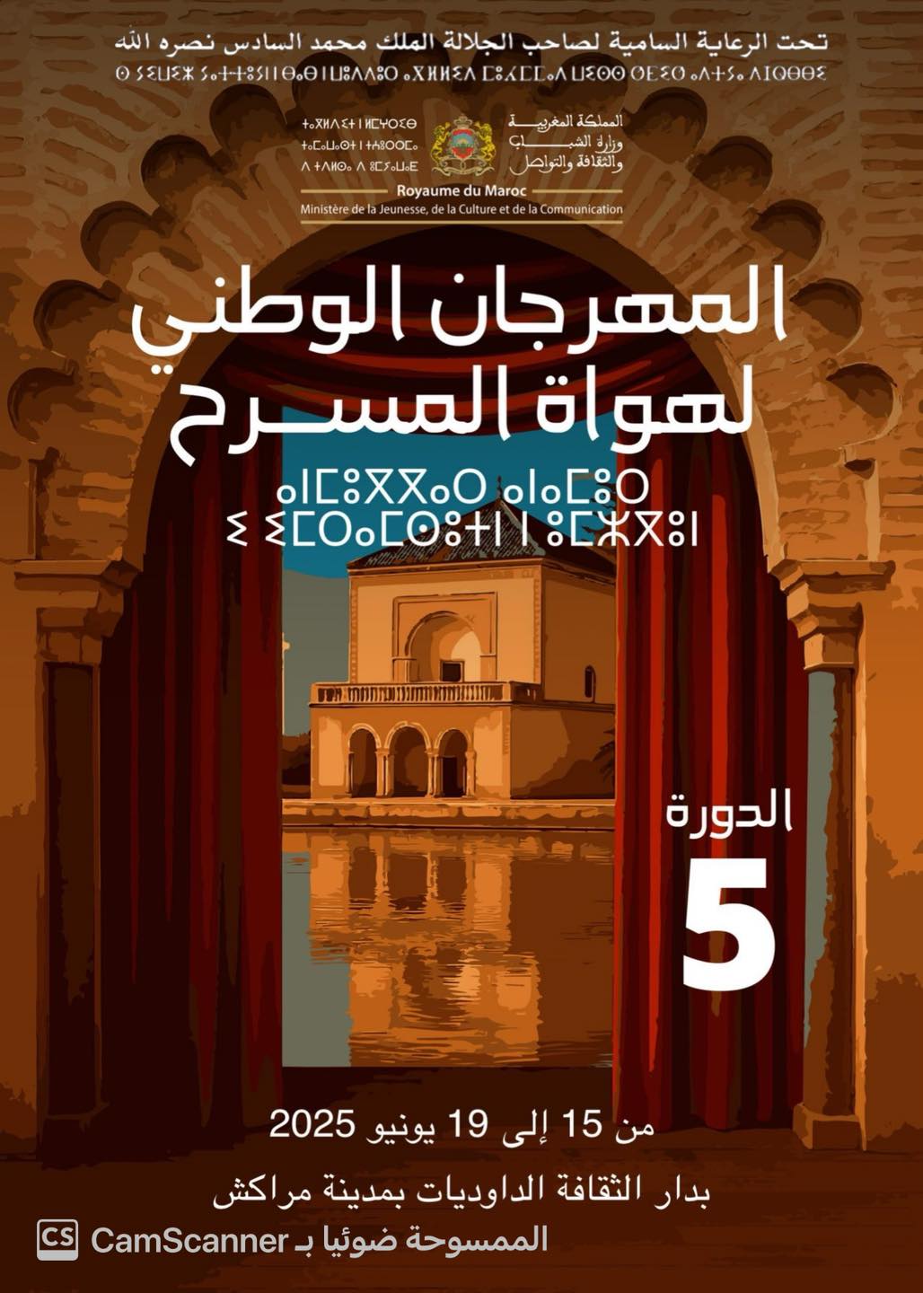 تحت الرعاية السامية لصاحب الجلالة الملك محمد السادس نصره الله تنظم وزارة الشباب والثقافة والتواصل -قطاع الثقافة- الدورة الخامسة للمهرجان الوطني لهواة المسرح في الفترة الممتدة ما بين 15 و19 يونيو 2025 بدار الثقافة الداوديات مراكش
